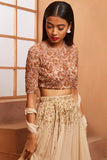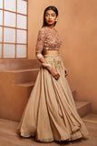Gold embellished blouse with beige lehenga with rosette gold embellishment & plain dupatta.