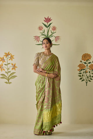 Green & Red bandhani saree teamed with a marodi work bagru blouse