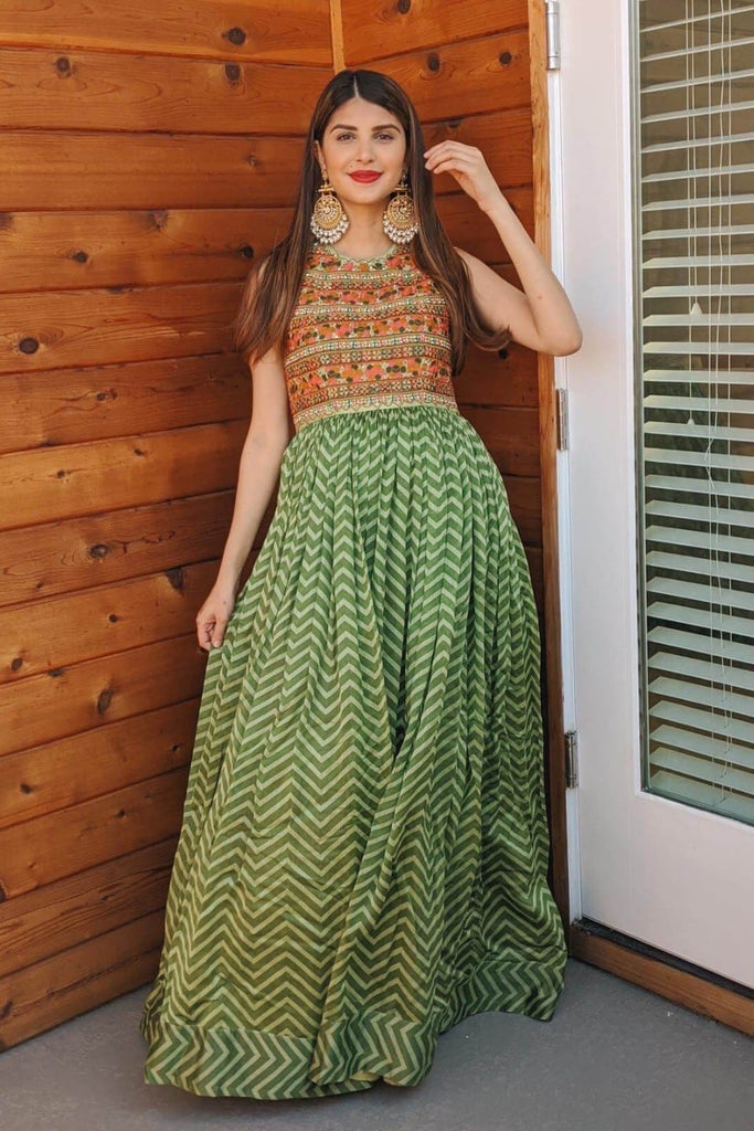 Label Anushree: Hand printed green maxi dress with hand embroidery.