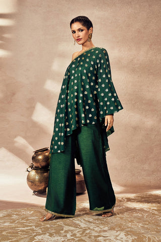 Details: Tunic- Foil printed one shoulder asymmetrical tunic | Flared Sleeve | Asymmetrical | Edged with embroidered borders and kinari gota Pant- Green straight pants embellished with embroidered border at the hem | Side seam closure