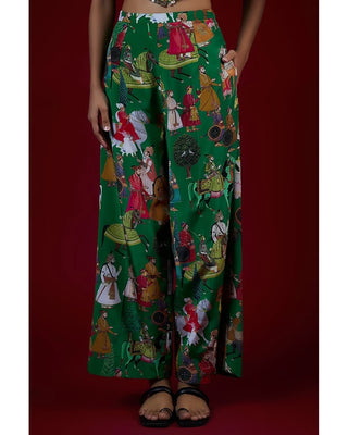 Expertly crafted with a green printed design, this pant suit set comes with a corset, trousers, and jacket accented with intricate embroidery. Elevate your style and make a statement with this unique and sophisticated ensemble. Perfect for special occasions or a professional setting.