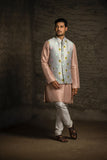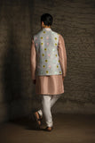 Grey meadow print dupion silk bandi with rose pink silk kurta and off white cotton silk churidar.
