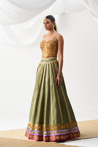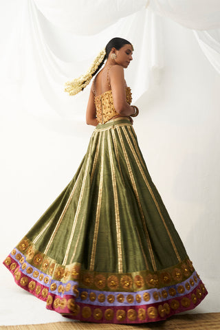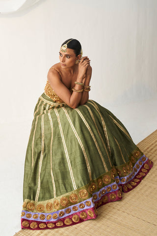 Antique embroidered corset paired with olive raw silk gota stripes lehenga which has dot embroidery on color blocked border.