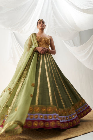 Antique embroidered corset paired with olive raw silk gota stripes lehenga which has dot embroidery on color blocked border.