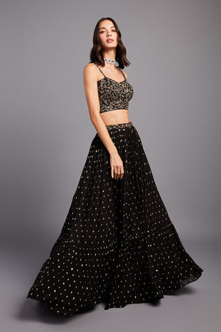 Two tiered sequence embellished skirt paired with sequence and glassbeads embellished brallet & sequence tulle dupatta