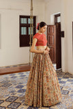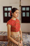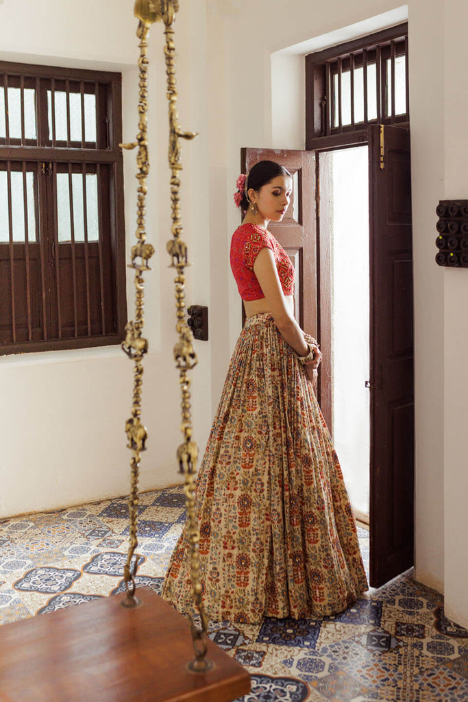 Printed lehenga highlighted with hand embroidery in colourful beads , threads & sequins all over the lehenga teamed with a mirror work croptop