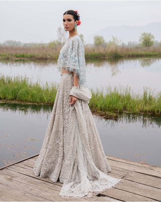 - LIGHT BEIGE-BASED, SILVER LEHENGA WITH INTRICATE THREADWORK FLORAL AND ARCHITECTURAL MOTIFS ADORNED WITH SEQUINS, CRYSTALS AND BEADS. THE LEHENGA IS STYLED WITH A HALF-SLEEVED BLOUSE WITH TASSEL DETAILS, A BORDERED TULLE DUPATTA WITH FEATHERS AND A