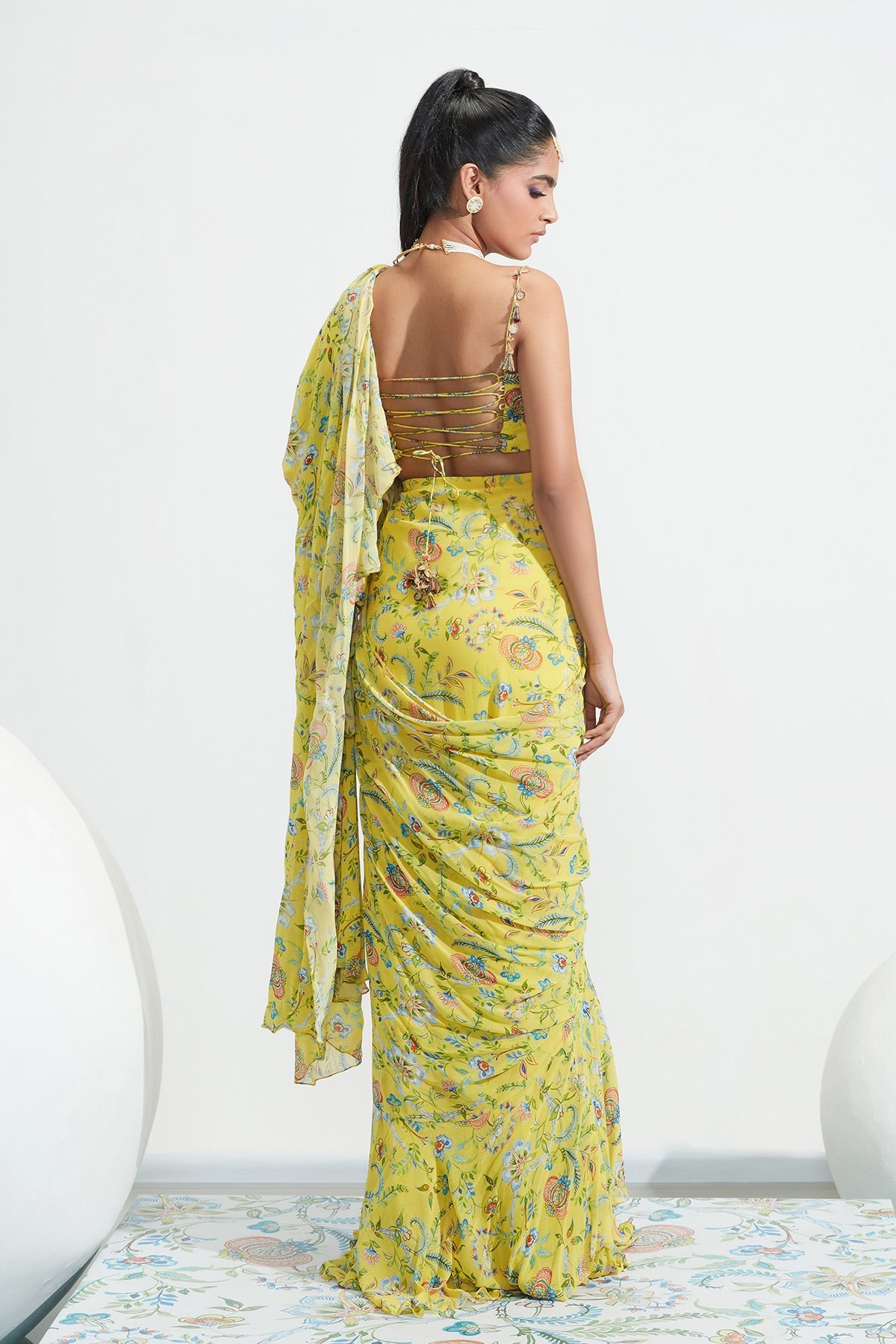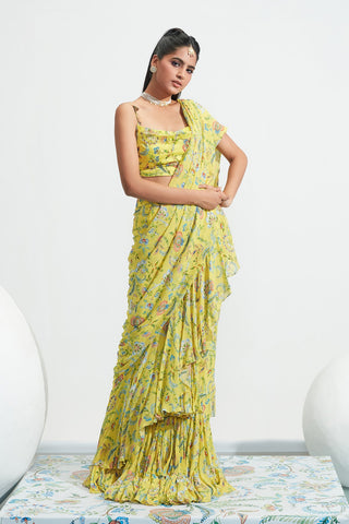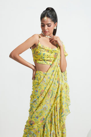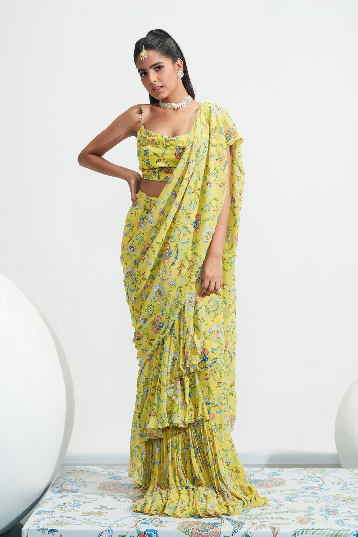 yellow printed georgette ruffle stitched saree with embroidered Embroidered satin organza blouse set