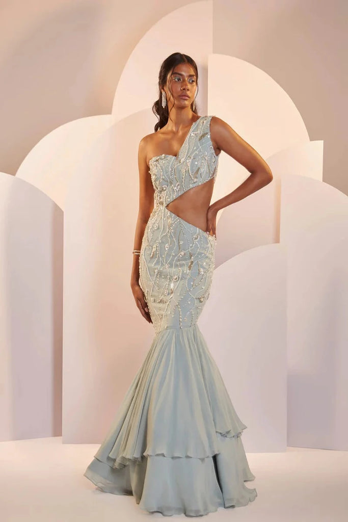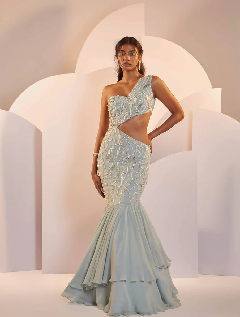 Mint green one shoulder cut out gown with hand embellished pearl and silver wavy lines