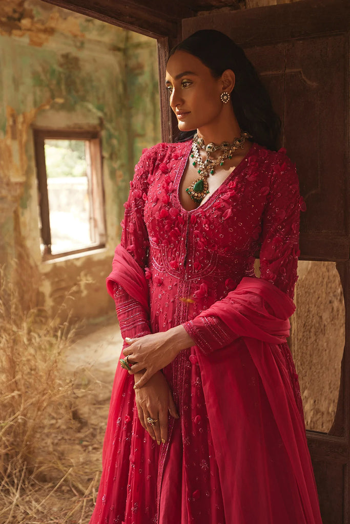 Fuchsia Georgette Embroidered Long Anarkali With Net Embroidered Dupatta
