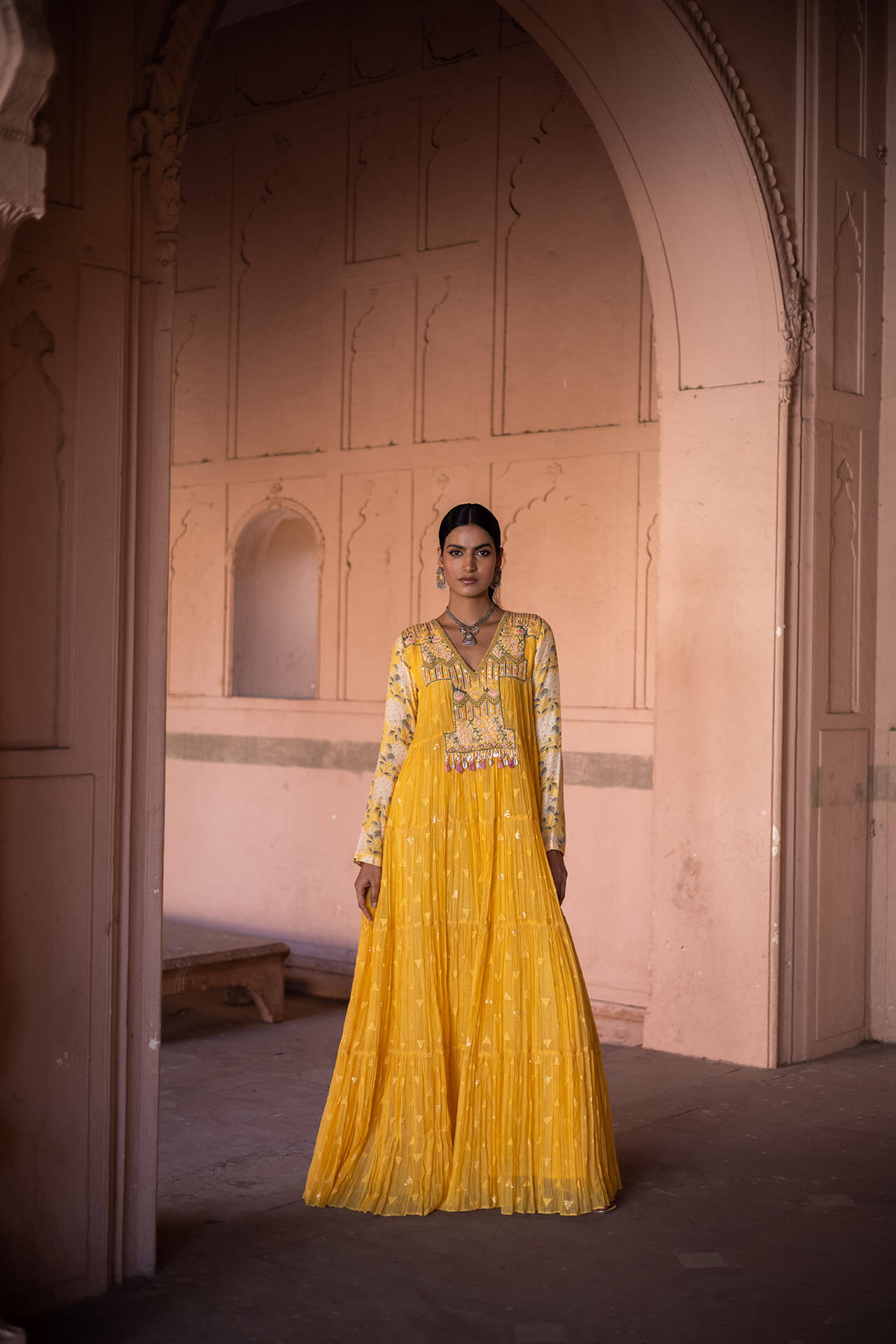 Yellow chanderi threadwork kurta with lots of flair & hand embroidery