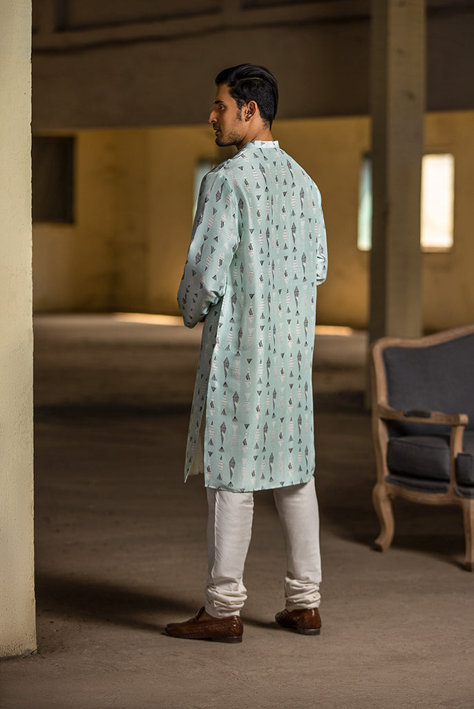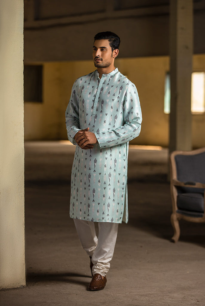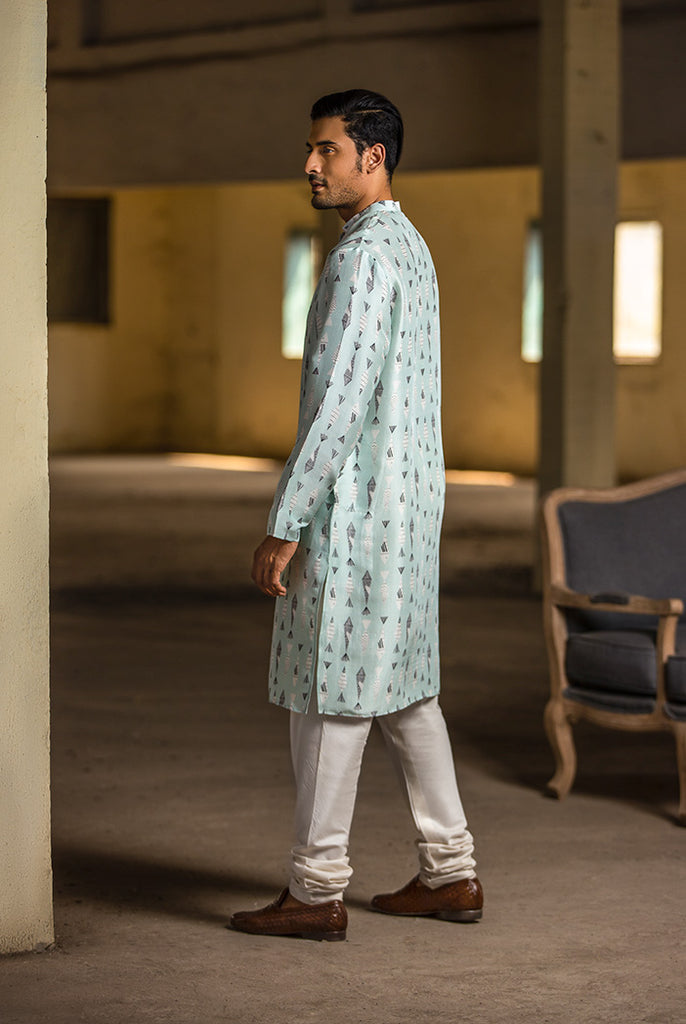 Ice blue fish print silk kurta with offwhite cottonsilk churidar.
