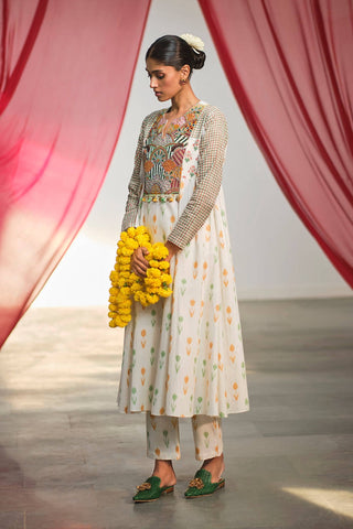 Offwhite beaded ikkat kurta seamlessly blended with block prints teamed with ikkat pants