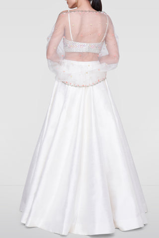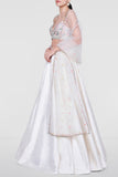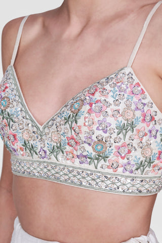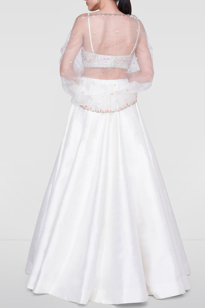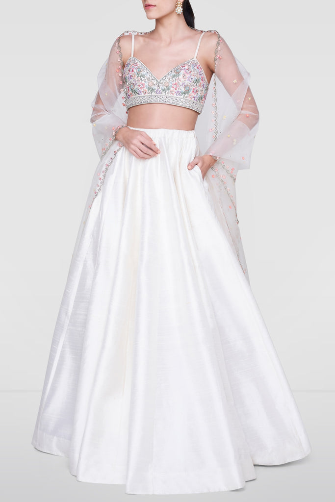 A contemporary classic, the cream Inayat Lehenga is crafted to perfection in exquisite raw silk and is teamed with a choli, intricately embroidered with motifs reminiscent of summer flowers. The lehenga is paired with an embroidered organza dupatta.