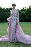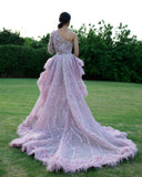 - MAUVE, ONE-SHOULDER TRAIL GOWN HANDCRAFTED WITH METAL THREADWORK, FINISHED WITH A FEATHER-DETAILED CAPE, SEQUINS AND STONES.