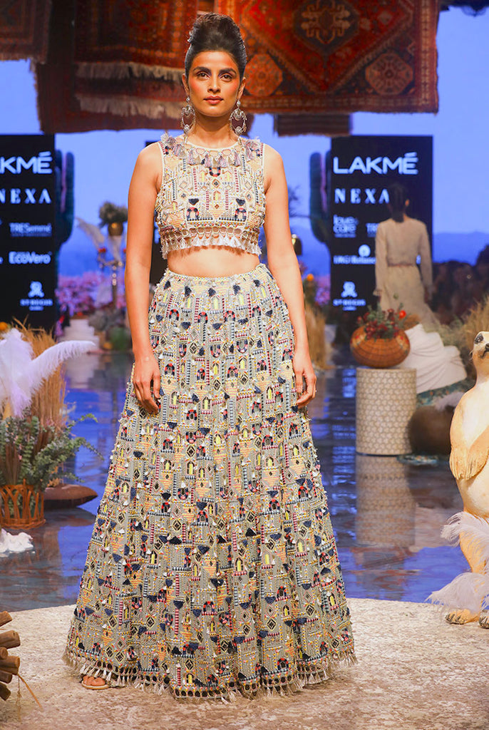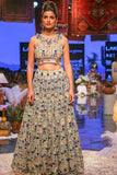 Designer Payal Singhal: Stone georgette embroidered choli with periwinkle blue georgette embroidered lehenga