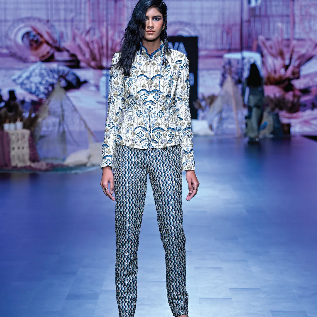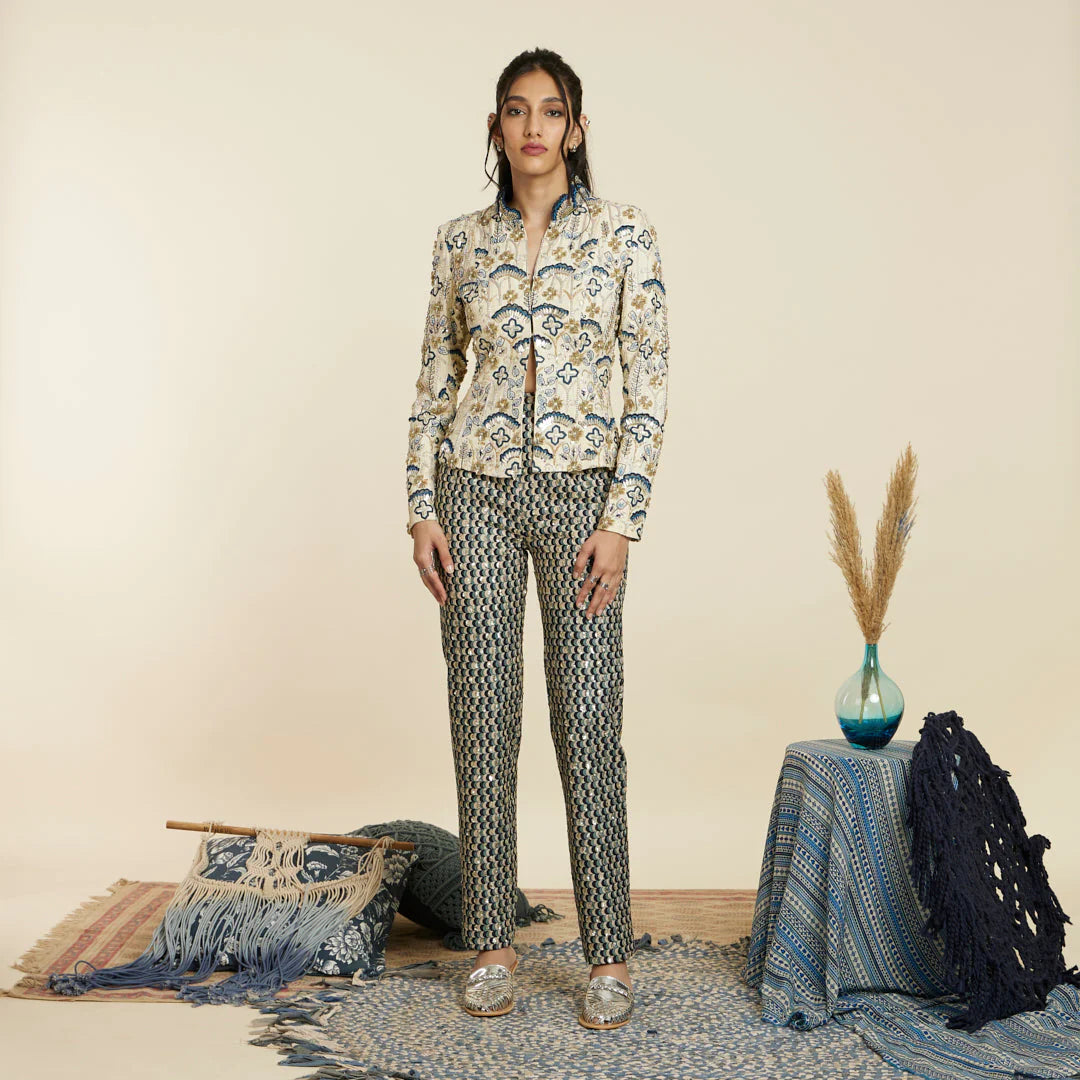 Featuring an ivory art deco embellished jacket paired with blue scallop embellished pants