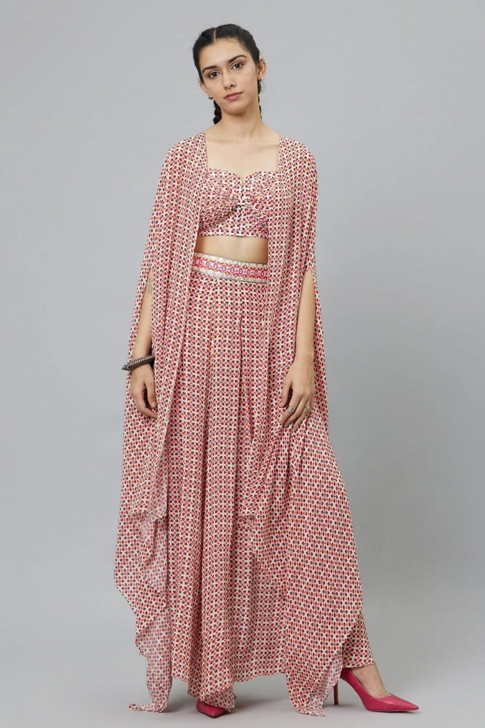 Ivory geometric print bikini bustier with box pleated pants and cape