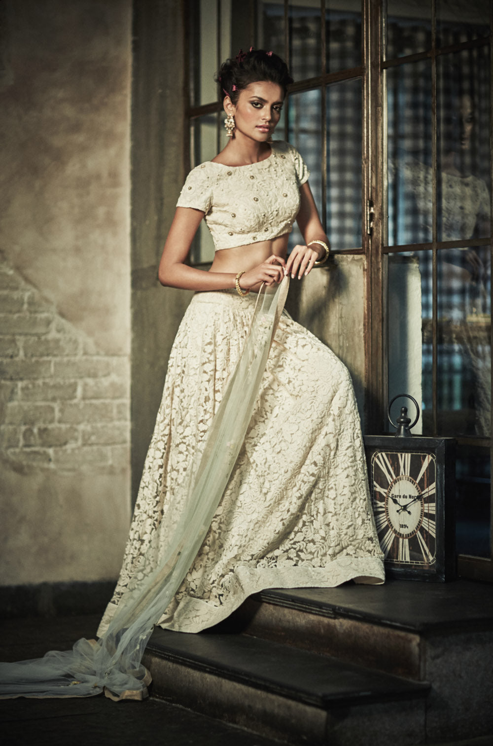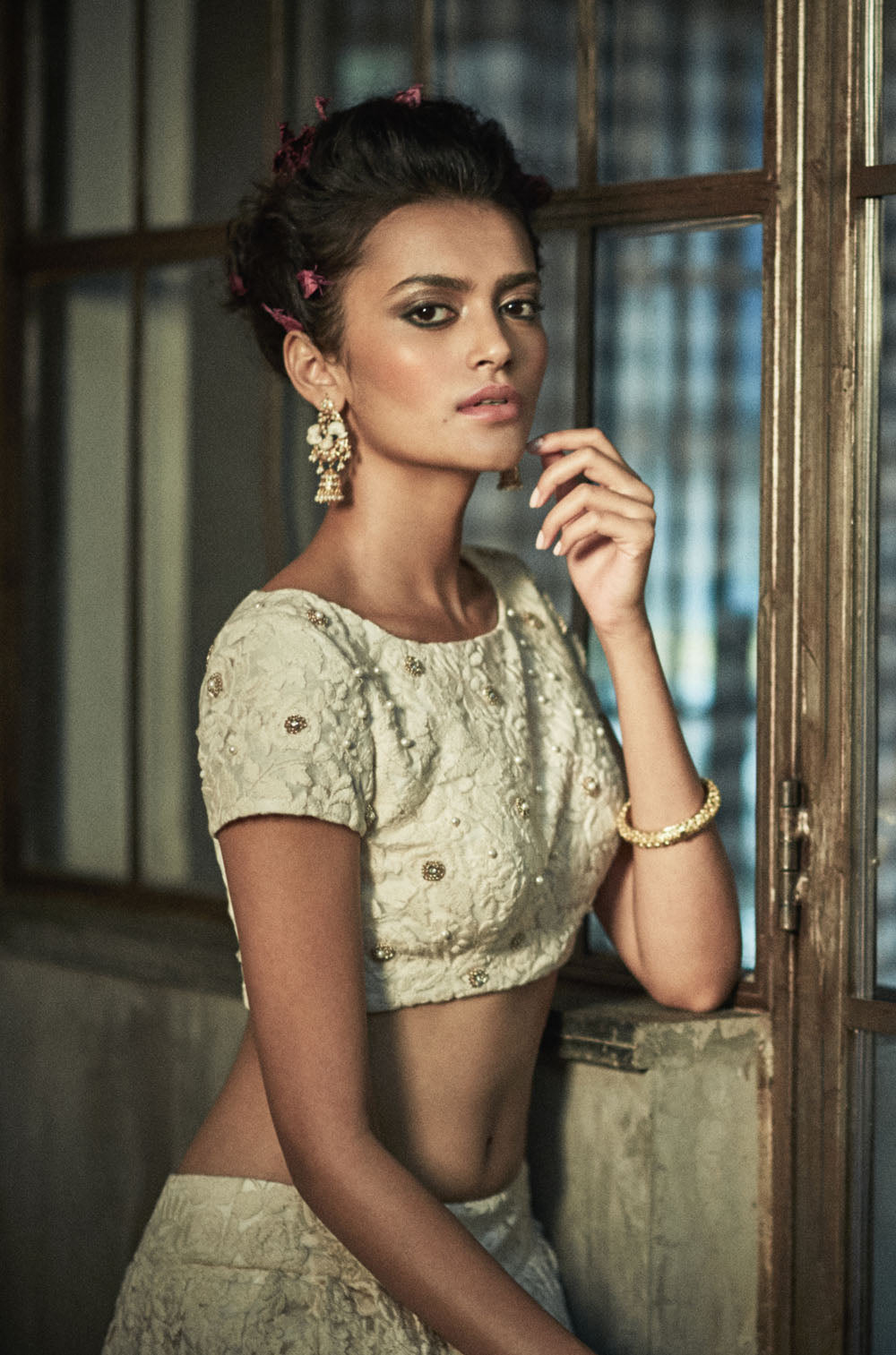 A crop top and high waisted skirt set are embroidered all over in ivory thread roses, gold and pearl blouse, and mint tulle dupatta with sparkly beaded flowers and leaves in fresh pinks and mints.