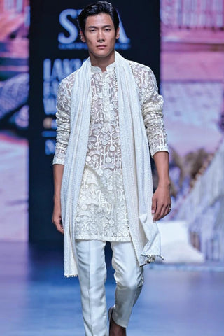 Featuring an ivory organza threadwork kurta paired with pants and lucknowi dupatta