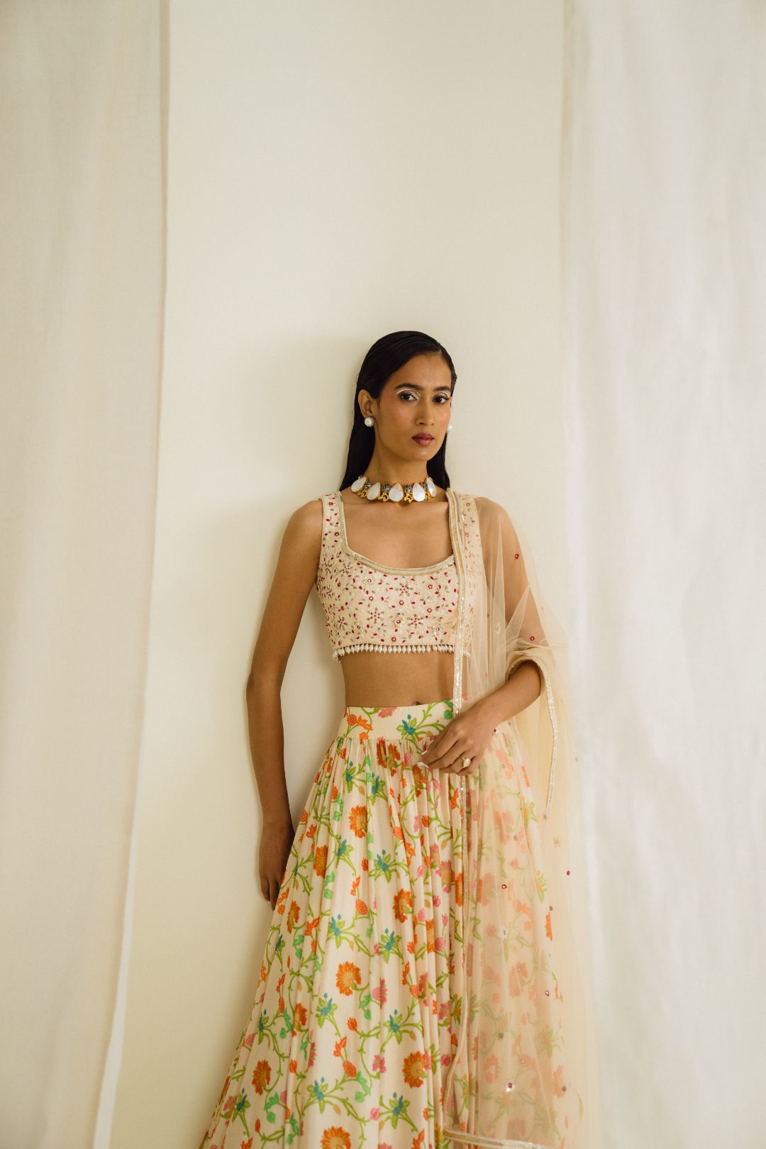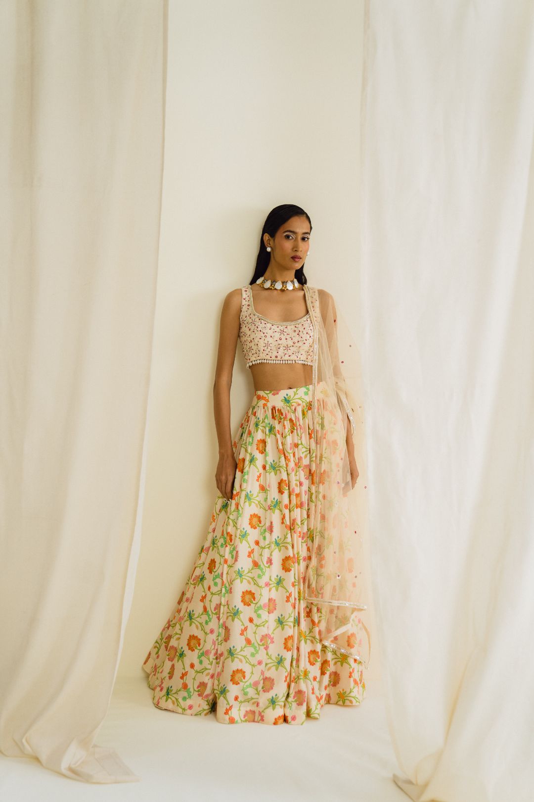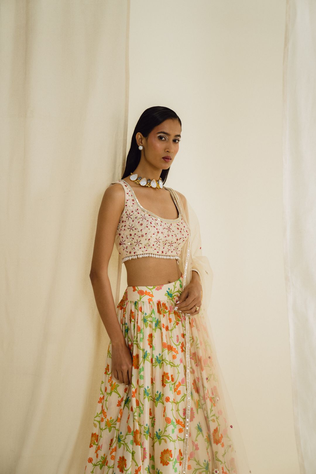 Featuring an ivory gathered printed skirt in Dupion silk. It is paired with an intricately embroidered tasseled blouse and net dupatta.