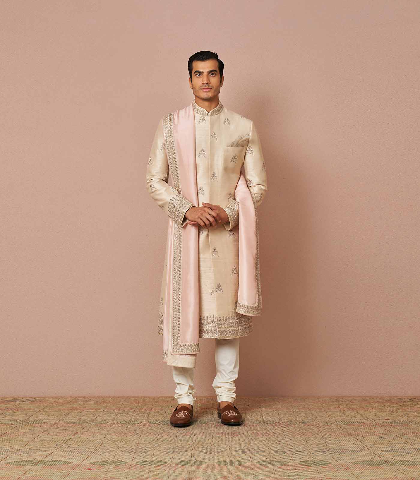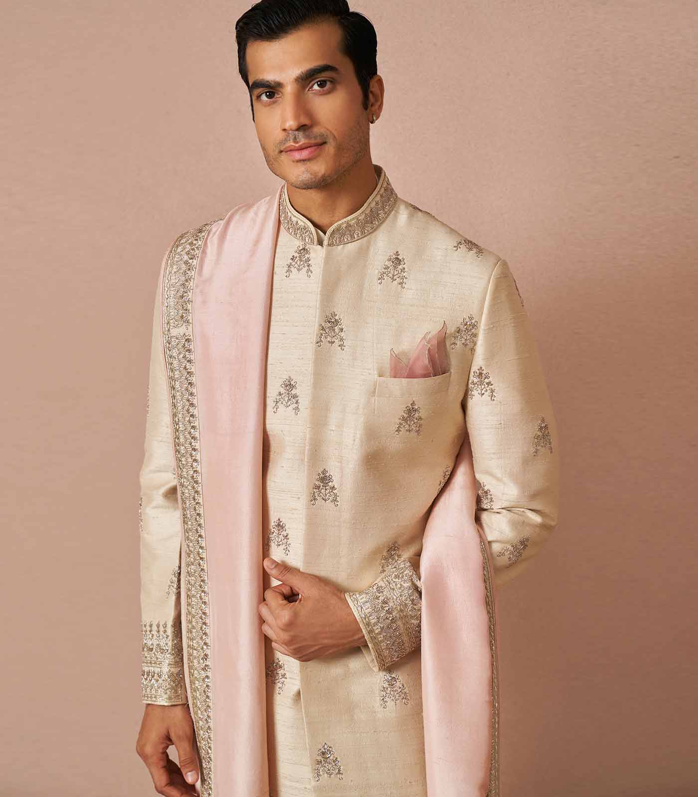 Ivory rawsilk butti embroidered sherwani set with silk baby pink dupatta