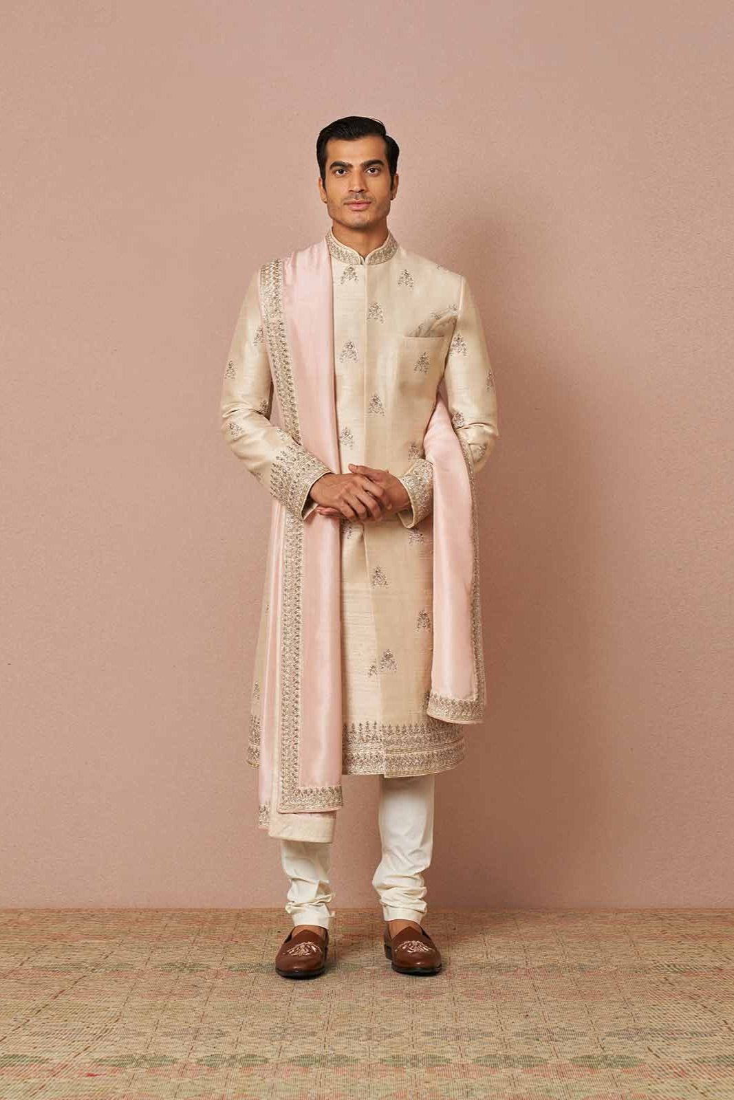 Straight from the paradise, our ivory rawsilk sherwani is embellished with zardozi embroidery, paired with an ivory silk kurta and a churidaar. It is further accompanied by a baby pink silk dupatta embroidered stunningly to complete the look.
