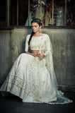 Ivory blouse and high waist vintage skirt with hand embroidered roses with pearl detailing and matching ivory tulle dupatta wit pearls and cascading thread roses.