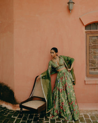Featuring a jade green printed gathered skirt in Dupion silk. It is paired with an intricately embroidered blouse and an embroidered organza dupatta.