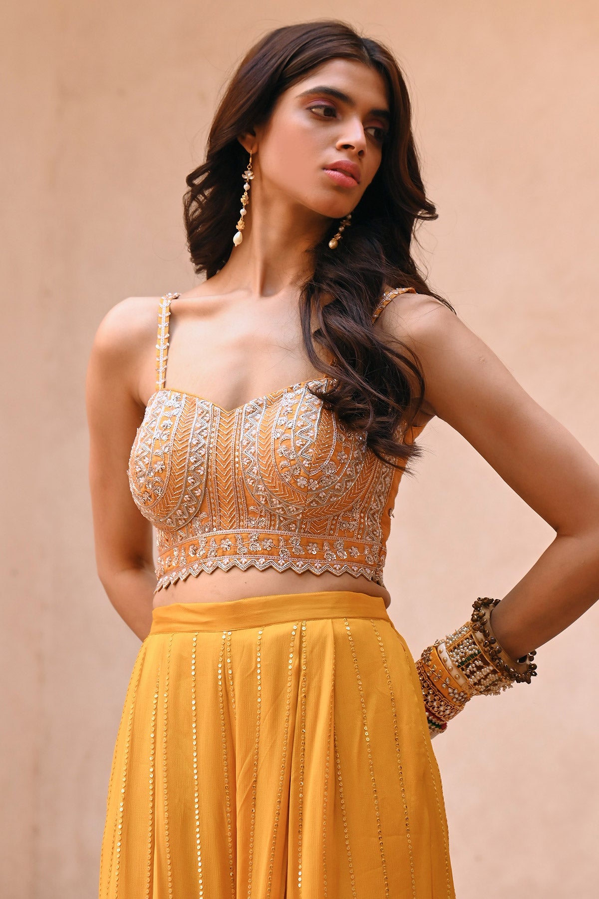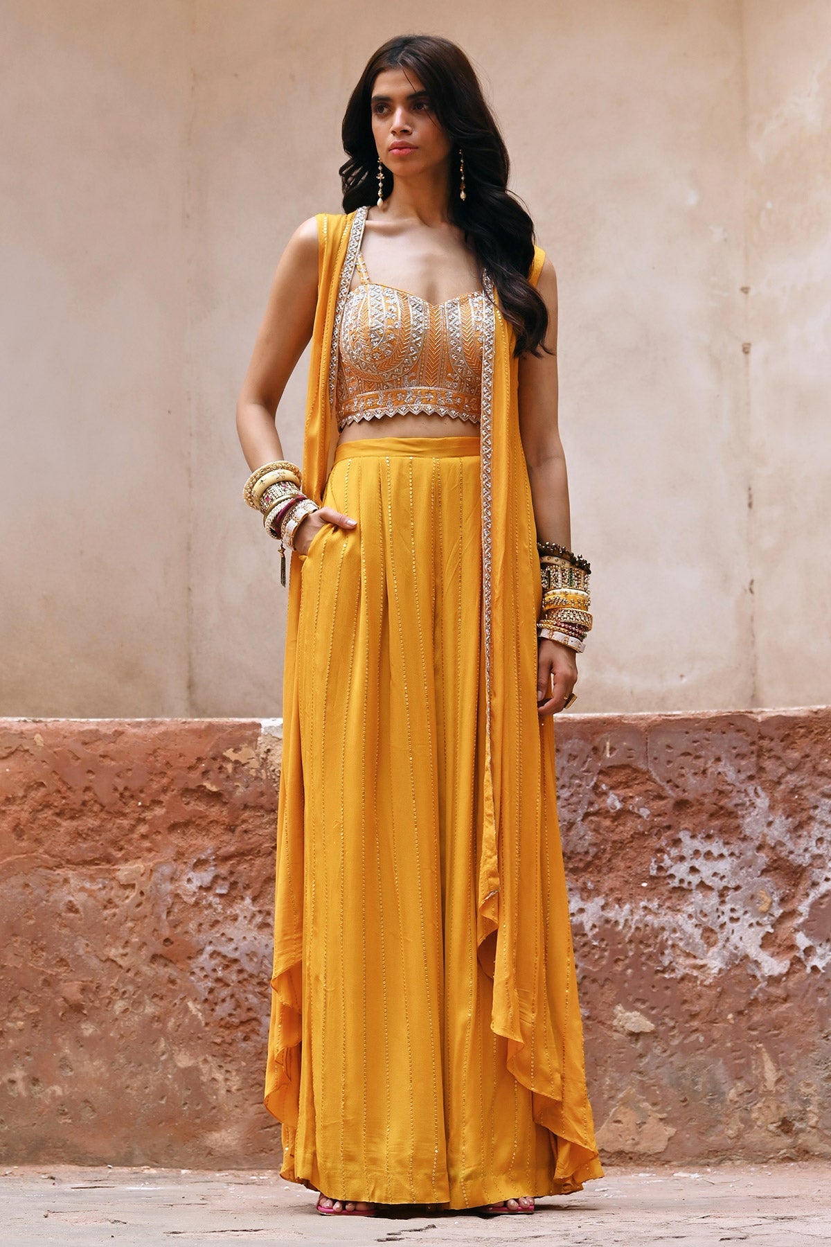 Glass bead, pearl, and zardozi blouse paired with georgette pants and jacket.