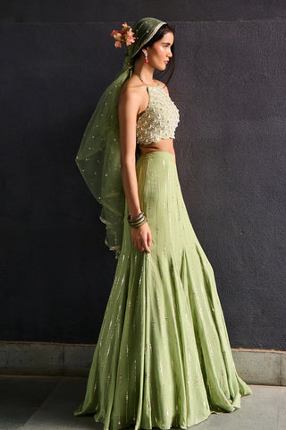 Olive Green Sequence Work Gusset Skirt Paired with Pearl Encrusted Halter Neck Blouse and Tulle Dupatta