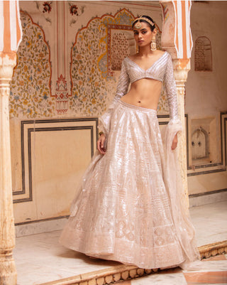 - FADED PEACH-HUED, SILVER LEHENGA WITH ARCHITECTURAL AND FOLIAGE MOTIFS IN PRINTED CHROME APPLIQUE. THE LEHENGA SKIRT IS PAIRED WITH A FULL-SLEEVED, WIDE-NECK, CROPPED BLOUSE HAVING CRYSTALS AND SEQUINS; AND A SCALLOP BORDERED, TULLE DUPATTA.