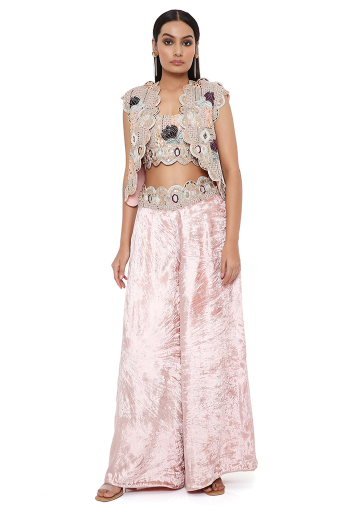 Jiya rose pink georgette embroidered scallop jacket with front embroidered bustier and palazzo