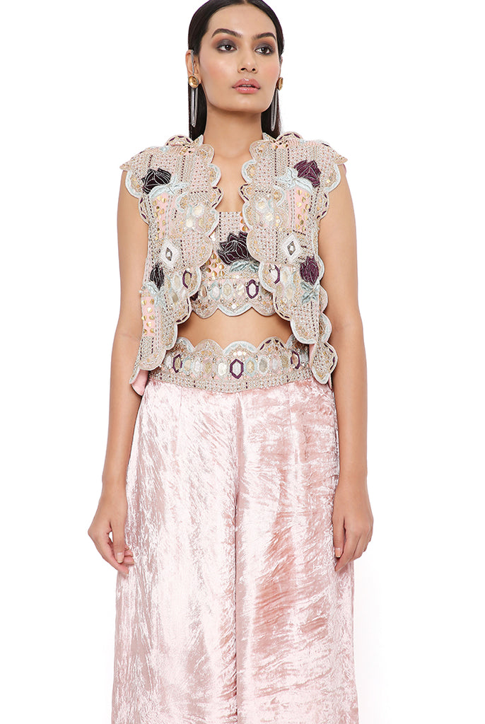 Rose pink georgette embroidered scallop jacket with front embroidered bustier and palazzo pants.