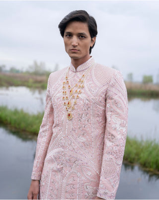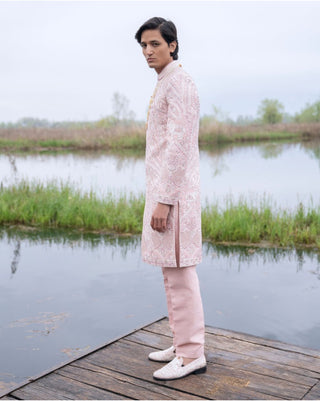 - ROSE QUARTZ PINK, COLLARED SHERWANI WITH INTRICATE IVORY THREADWORK ON REGAL MOTIFS ADORNED WITH BEADS AND CRYSTALS, STYLED WITH A PAIR OF RAW SILK PANTS.