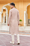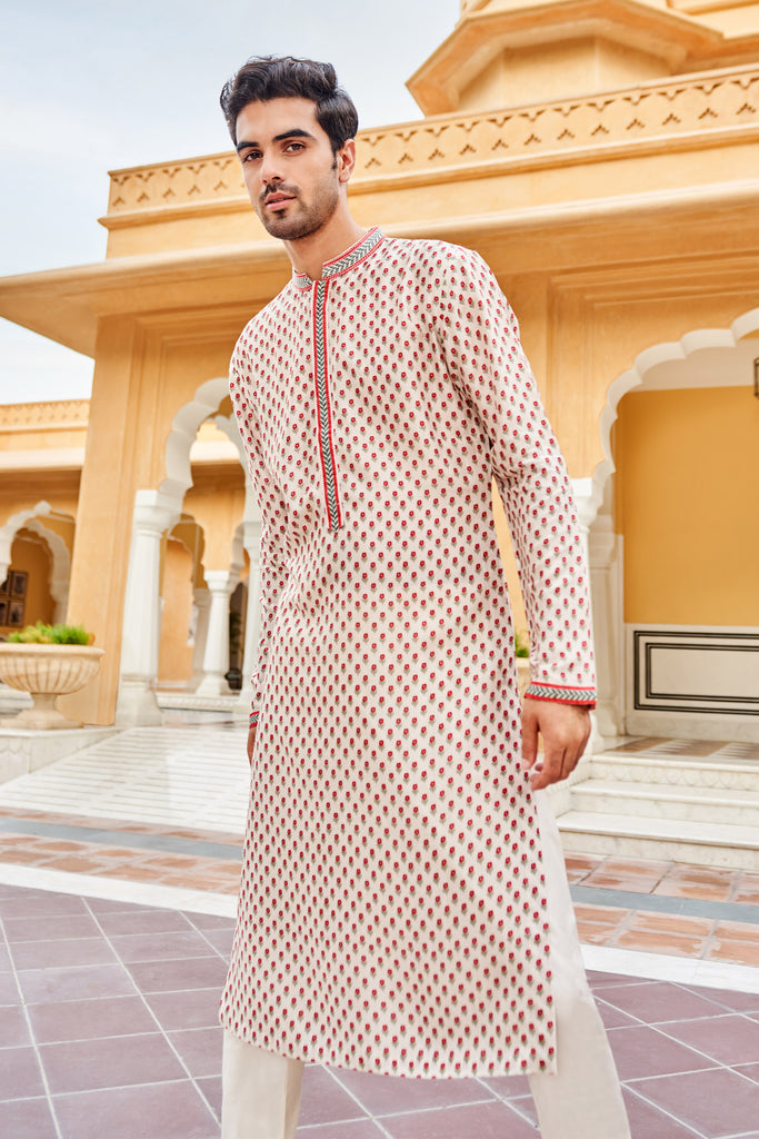 With its understated elegance and printed details all over, the Kanav kurta hits the wear list for celebrations. Crafted in raw silk, this silhouette will take up a special place in your heart.