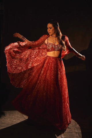 Placement Embroidered Sleveless Printed Organza Blouse and Plain Printed Organza Lehenga Paired with Embroiderey Detailed Printed Organza Cape