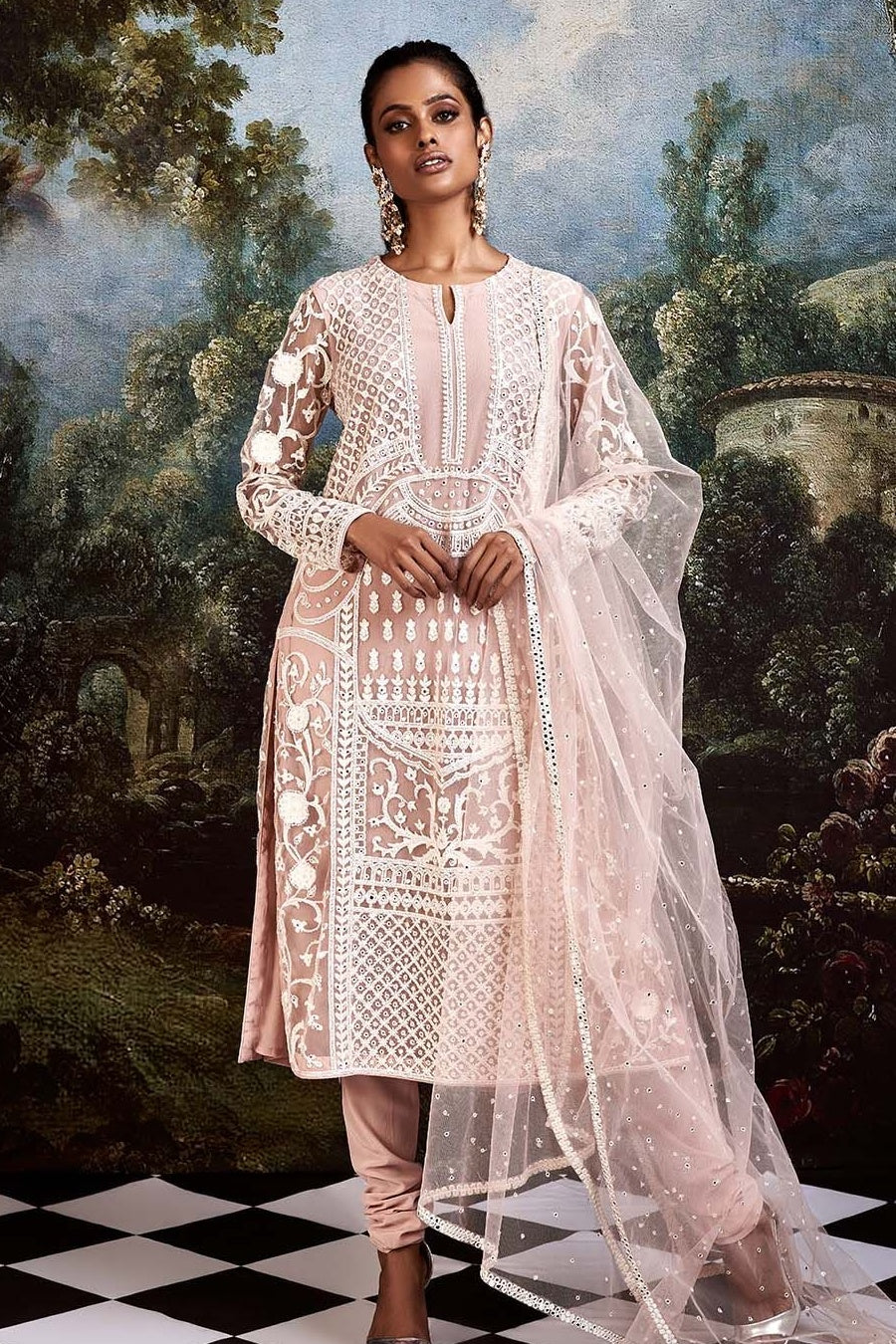 • STYLED WITH A CHURIDAR AND TULLE DUPATTA WITH MIRROR WORK DETAILS.