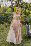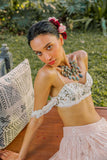 A fresh rose, vintage lace skirt embroidered with pearls; hand woven, hand embroidered floral zardosi raw silk blouse, applique and tasseles, off shoulder