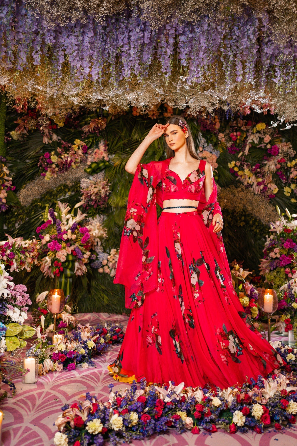 Hot pink Printed lehenga embellished blouse , embellished organza dupatta and hand embroidered belt
