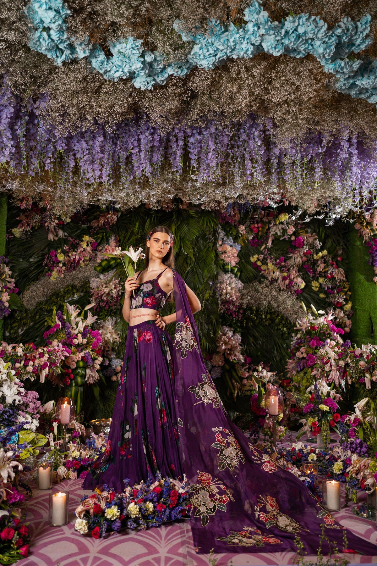 Purple Printed lehenga embellished blouse , embellished organza dupatta and hand embroidered belt