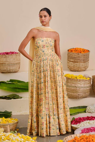 Fresh yellow floral printed tube dress with a shaded organza dupatta