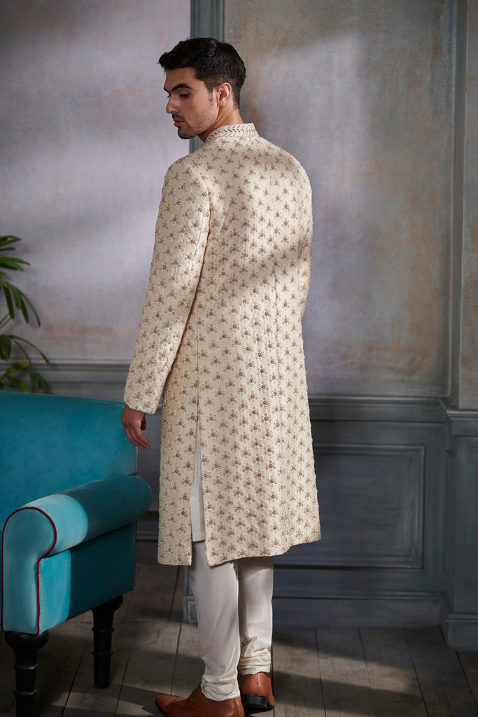 Refined yet striking, the cream silk Lian Sherwani is a regal addition to your wardrobe. The all-over zardozi embroidery complements the look and adds a dimensional quality.