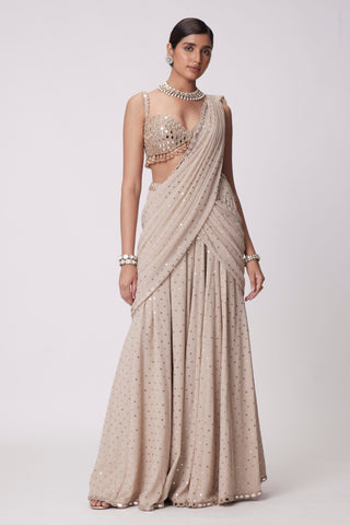 Light Beige Georgette Draped Saree with Real Hand Cut Mirror Embroidered Sleeveless Blouse.