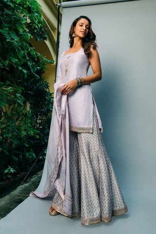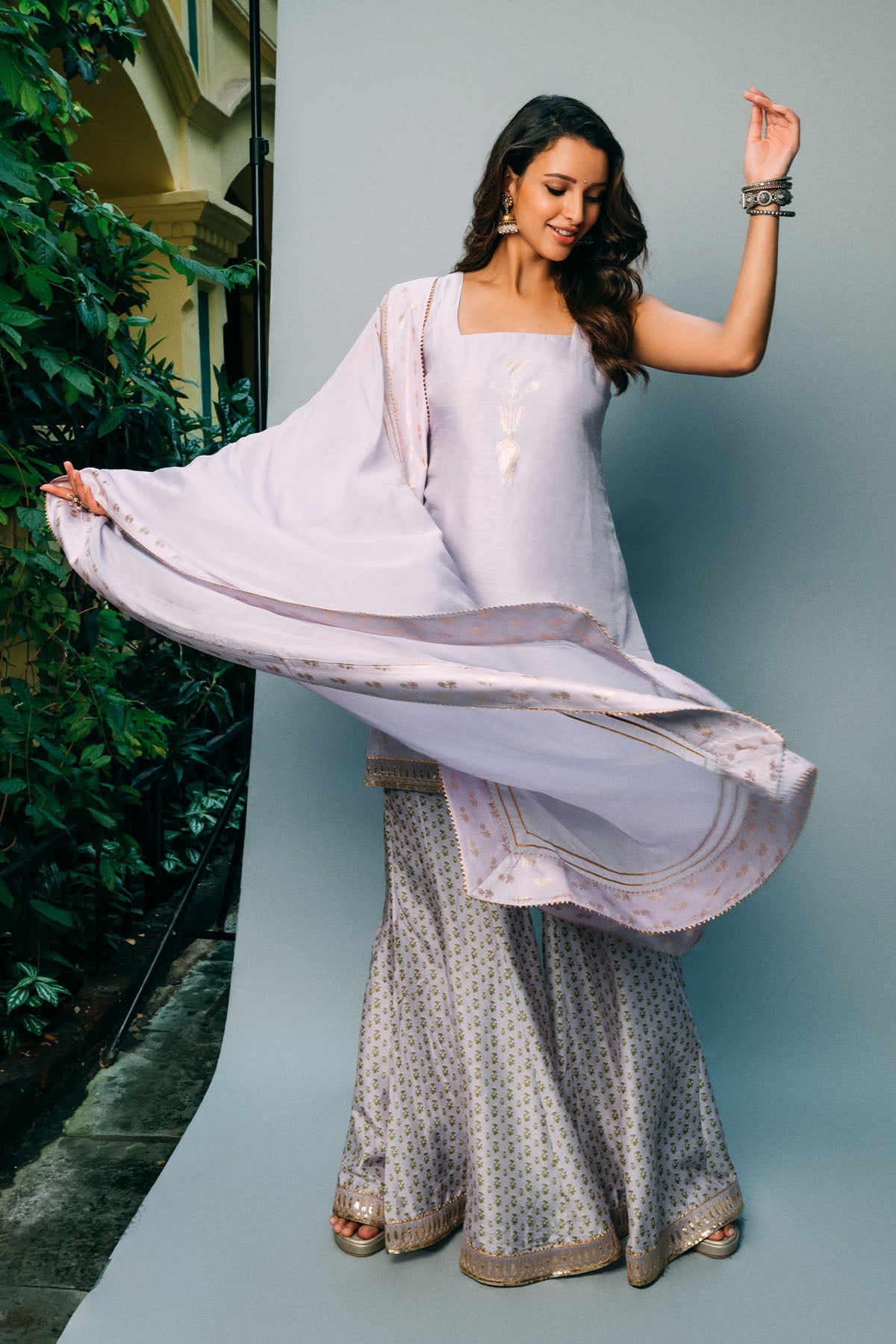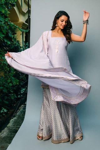 Styling: Pair the Sharara set with statement gold or antique jewelry and mojris. Style it with our beautiful organza dupatta draped elegantly over one shoulder for a more elevated look. Accessorize it with a beautiful potli bag.
