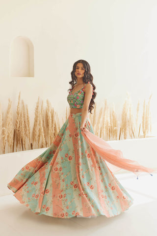Pink & Blue printed lehenga a soft hakoba fabric teamed with a floral embroidered bustier & mulmul duppata.