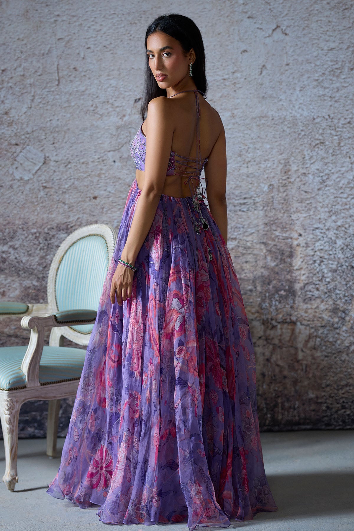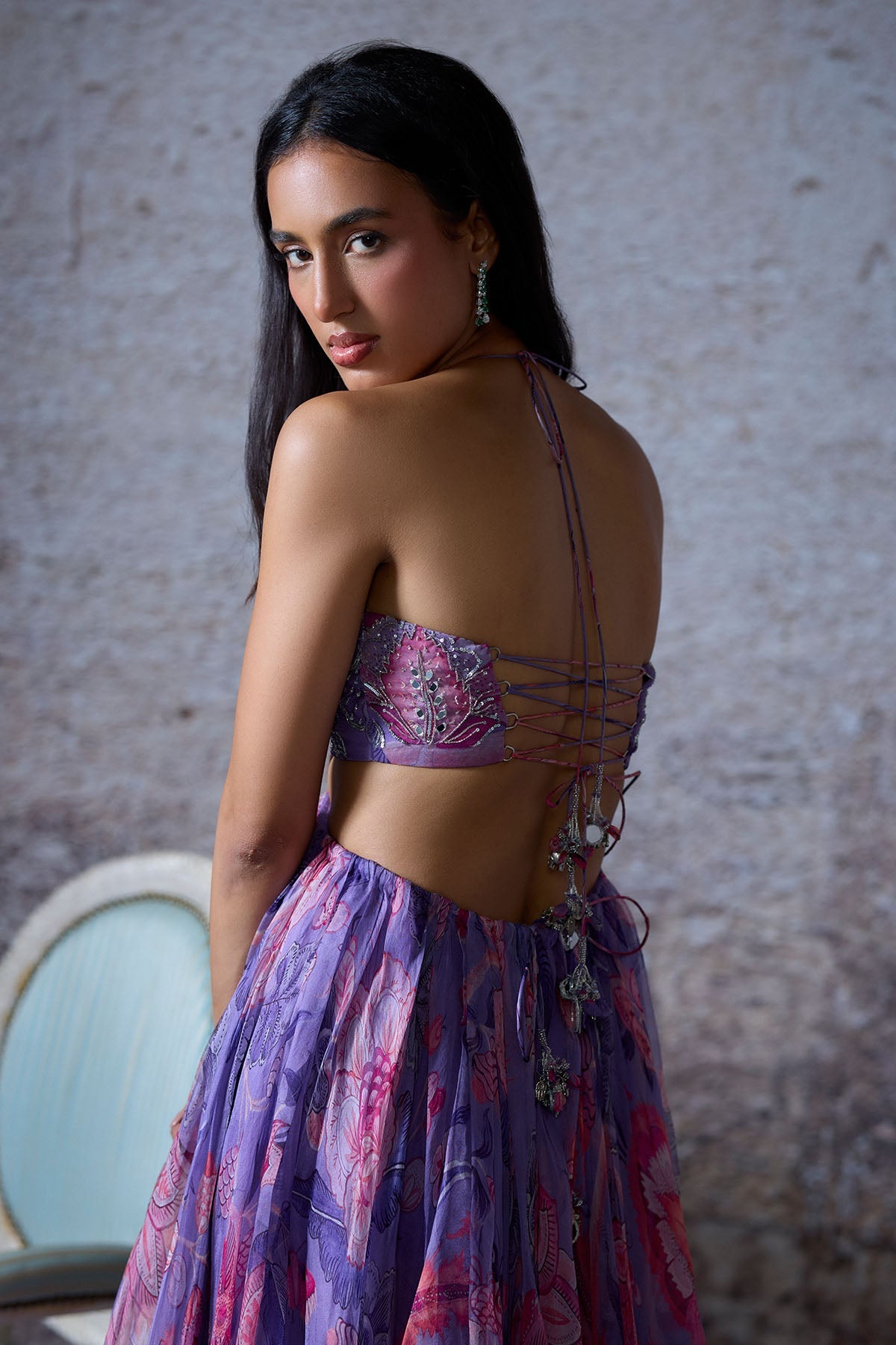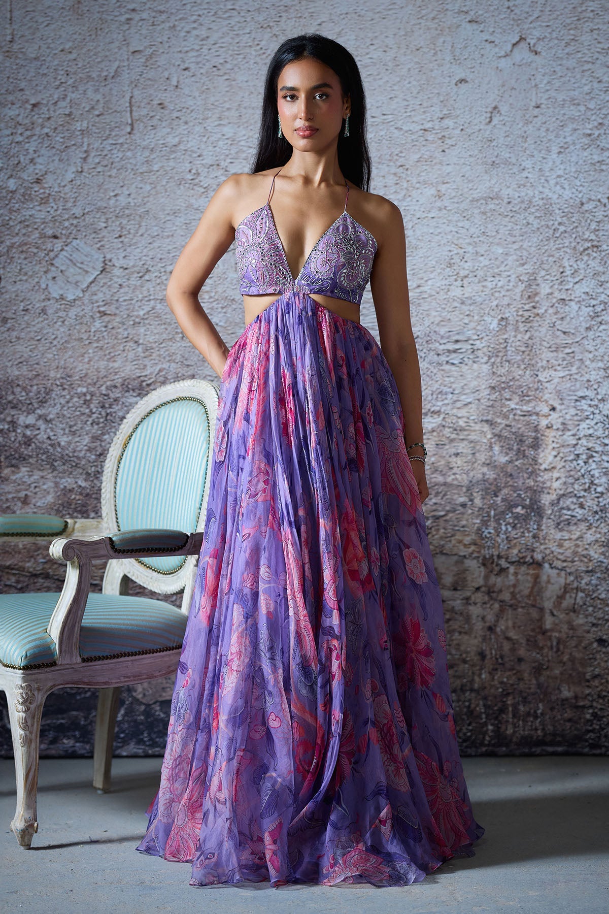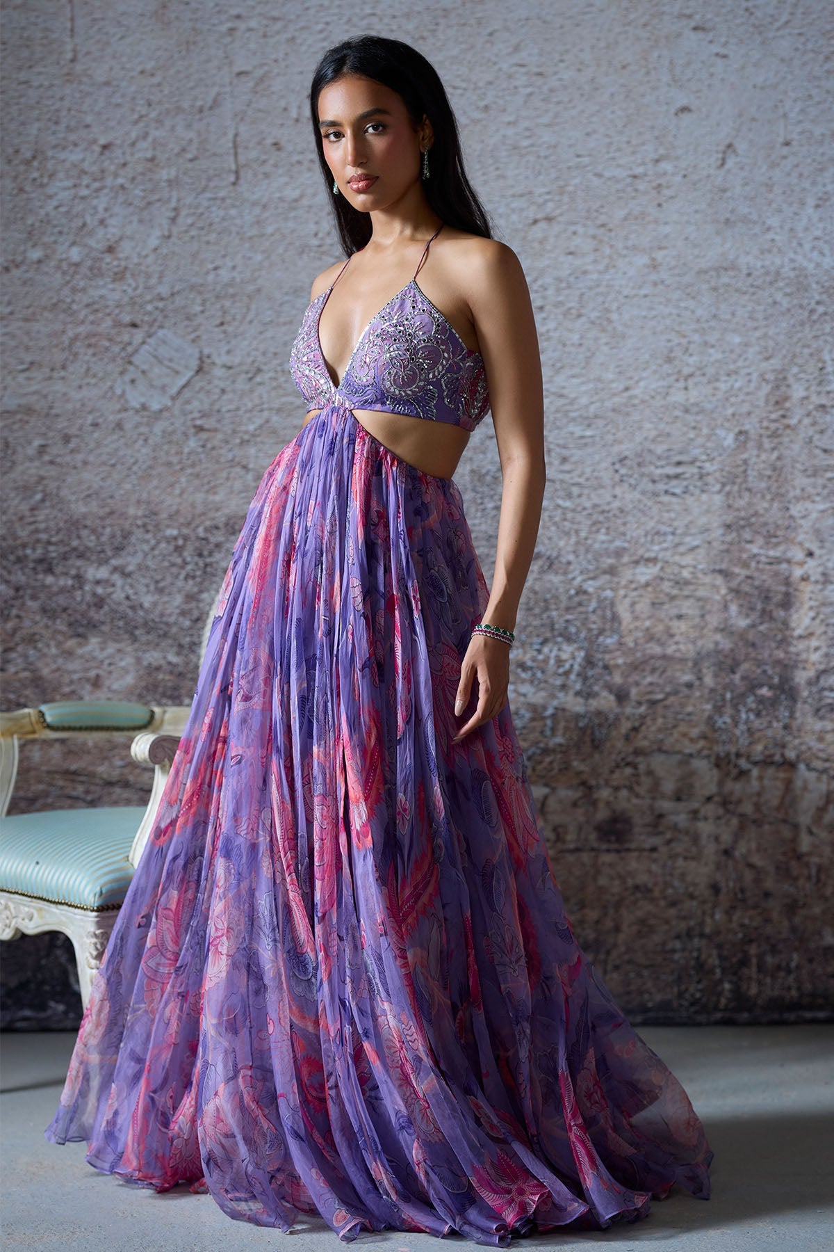 EMBROIDERED GOWN FEATURING CUT OUTS ON THE MIDRIFF AND TIE-UPS FOR A CINCHED FIT .