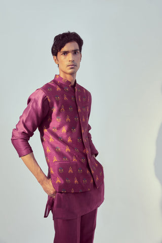 Featuring a magenta kurta bandi set printed in Dupion silk. It is paired with a solid chanderi silk kurta and pants.