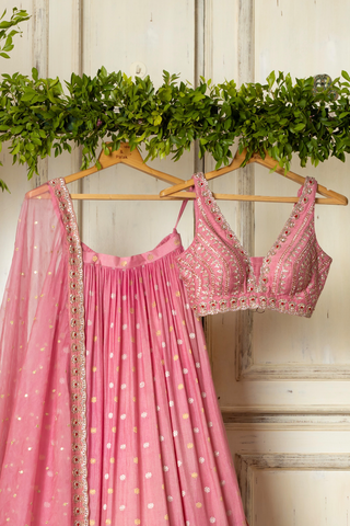 Silk jamewar skirt with zari detailing paired with hand-embroidered blouse & organza dupatta