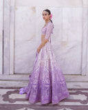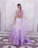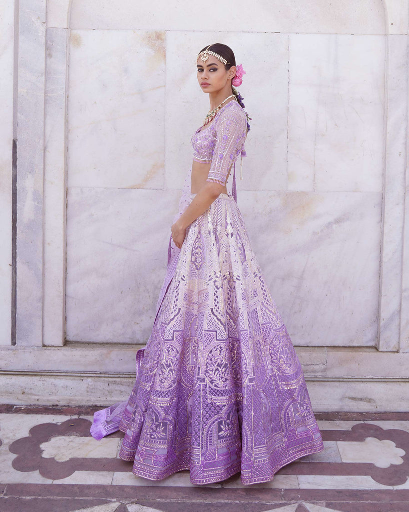 - LAVENDER, OMBRE LEHENGA WITH ARCHITECTURAL AND FOLIAGE MOTIFS IN LIGHT SILVER CHROME APPLIQUE. THE LEHENGA IS STYLED WITH A CROPPED BLOUSE WITH TASSEL DETAILS AND A TULLE DUPATTA WITH THREADWORK FRINGED-BORDER.